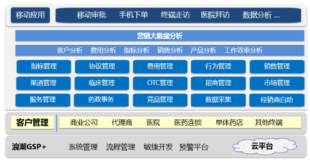 系统涵盖20余个功能模块、600余个功能点,覆盖医药企业全面营销管理,集成异构系统,支持移动应用,实现营销一体化。